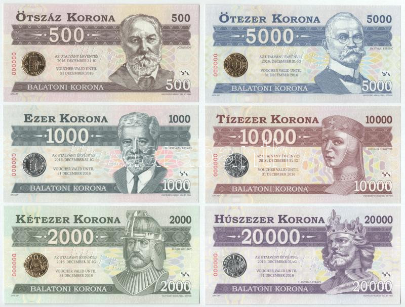 2012. 500 Balatoni Korona - 20.000 Balatoni Korona (6xklf) mind "MINTA" perforációval, "000000" sorszámmal. Teljes sor! T:UNC / Hungary 2012. 500 Balatoni Korona - 20.000 Balatoni Korona (6xdiff) local money, all with "MINTA (specimen)" perforation, with "000000" serial number. Complete series! C:UNC