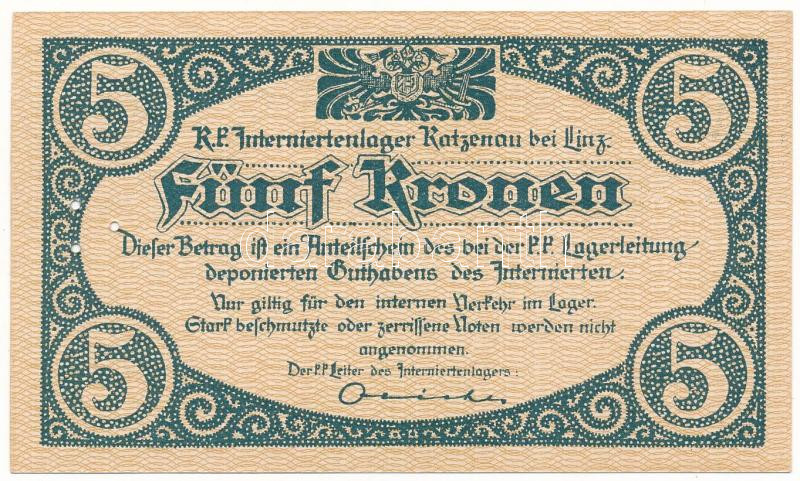 Ausztria / Katzenau Hadifogolytábor Linz közelében ~1914-1918. 5K három lyukkal perforálva T:UNC,AU /