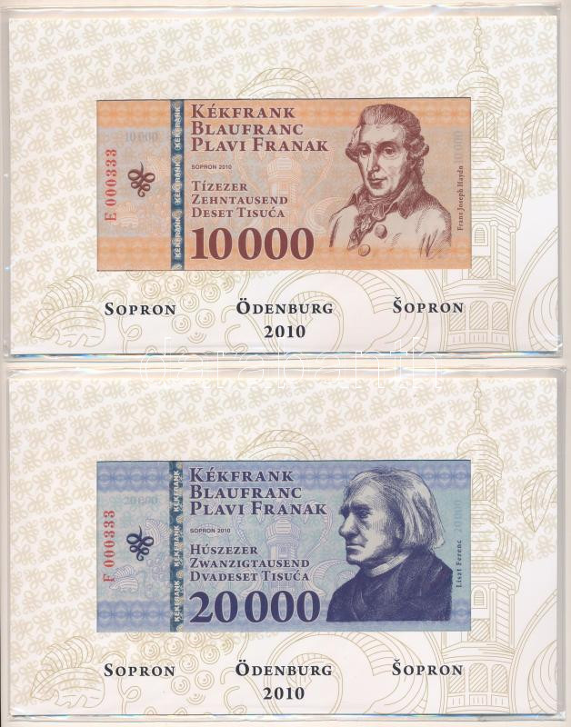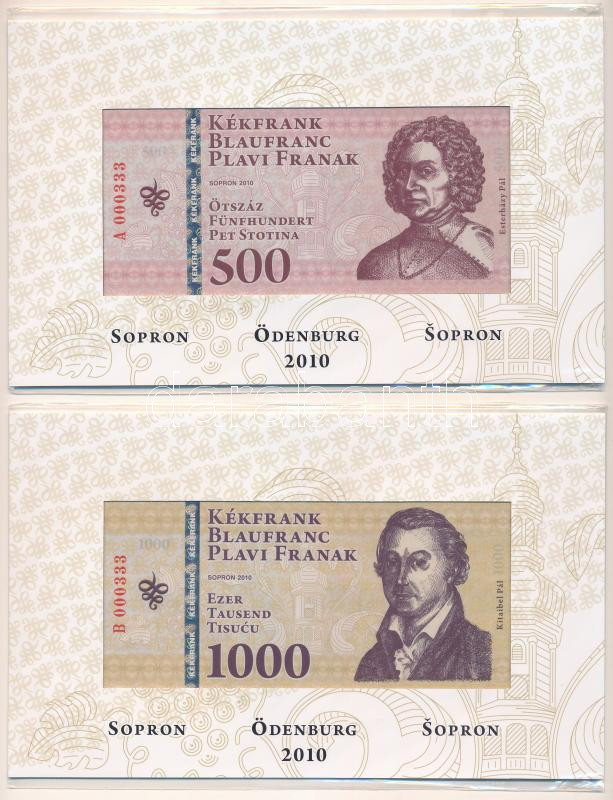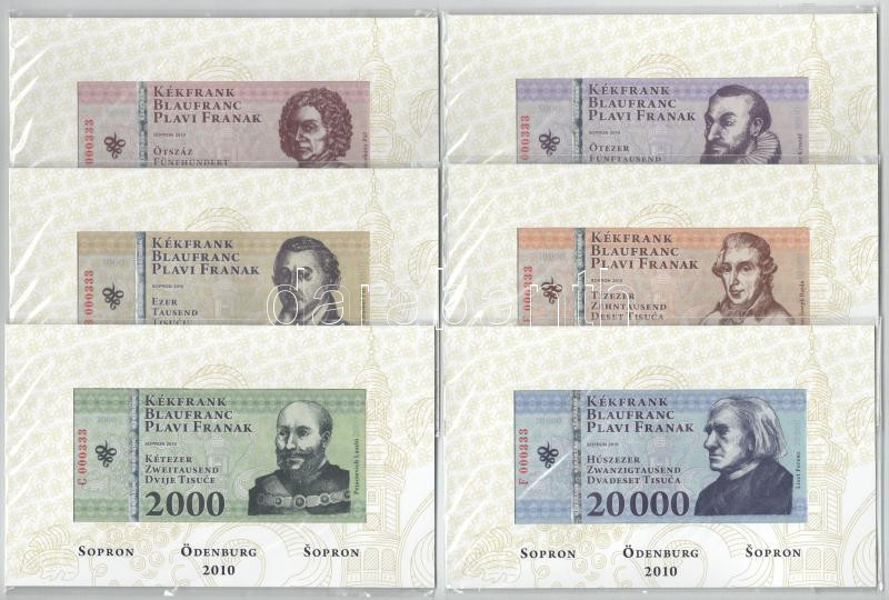 Sopron 2010. 500 Kékfrank + 1000 Kékfrank + 2000 Kékfrank + 5000 Kékfrank + 10.000 Kékfrank + 20.000 Kékfrank, mind azonos "000333" sorszámmal, de eltérő sorozatjellel, teljes sor, minden bankjegy az eredeti, kibocsátáskori díszcsomagolásában T:UNC / Hungary 2010. 500 Kékfrank + 1000 Kékfrank + 2000 Kékfrank + 5000 Kékfrank + 10.000 Kékfrank + 20.000 Kékfrank all with the same "000333" serial numbers but different prefixes, full set, all banknote with official display packaging C:UNC