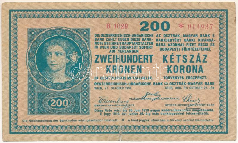 1918. 200K "B 1029 *014937" hullámos hátlappal, a középső függőleges hajtás mentén alul és felül szakadás T:F / Hungary 1918. 200 Korona "B 1029 *014937" with wavy pattern on backside. Tears along the central foldline at the upper and lower edges C:F