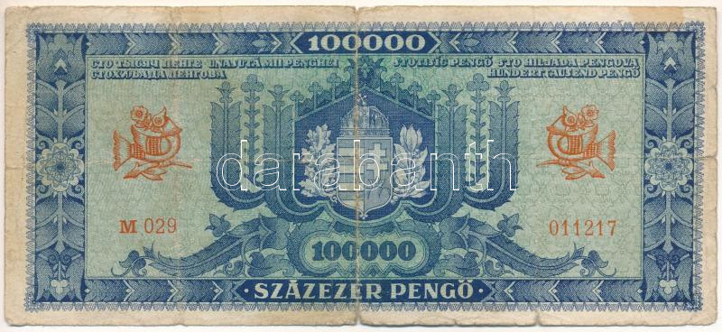 1945. 100.000P kék színű, zöld "MNB" bélyeg nélkül, de a bélyeg nyoma kivehető, "M 029 011217" T:VG / Hungary 1945. 100.000 Pengő blue color, without green "MNB" stamp but with the visible gluemark of the stamp, "M 029 011217" C:VG