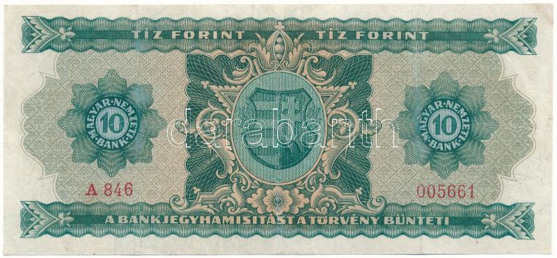 1946. 10Ft "A 846 005661" T:F restaurált / Hungary 1946. 10 ... https://www.darabanth.com/de/45-Gross-Auktion/45.1/Numismatik/Ungarische-Banknoten~18696/1946-10Ft-A-846-005661-TF-restauralt-Hungary-1946-10-Forint-A-846-005661-CF-restored3Cbr-~II3424319