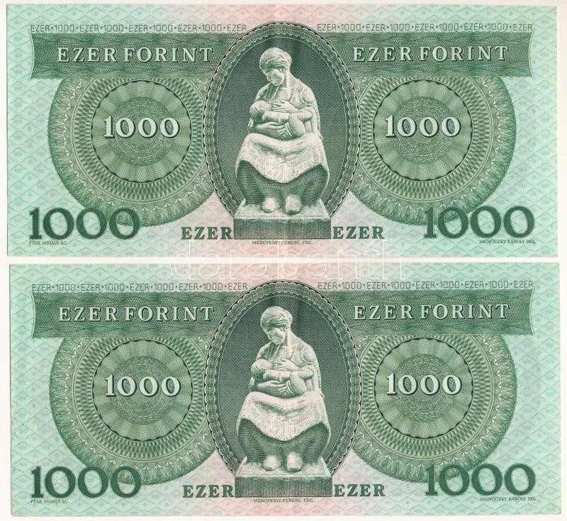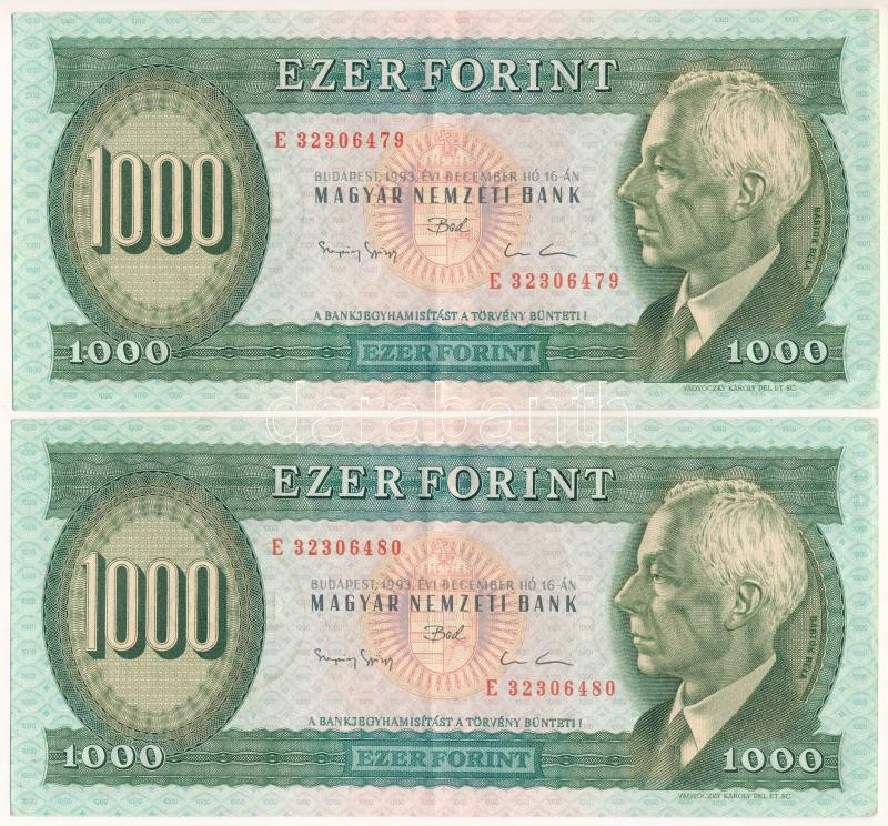 1993. 1000Ft (2x) sorszámkövetők "E 32306479 - E 32306480" T... https://www.darabanth.com/de/45-Gross-Auktion/45.1/Numismatik/Ungarische-Banknoten~18696/1993-1000Ft-2x-sorszamkovetok-E-32306479-E-32306480-TF-szep-papir-Hungary-1993-1000~II3434932