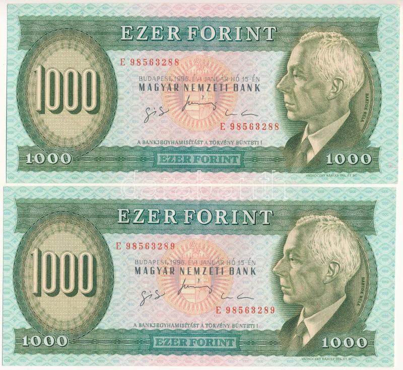 Beschreibung: 1996. 1000Ft (2x) sorszámkövetők "E 98563288 - E 98563289" T:XF / Hungary 1996. 1000 Forint (2x) consecutive serials "E 98563288 - E 98563289" C:XF