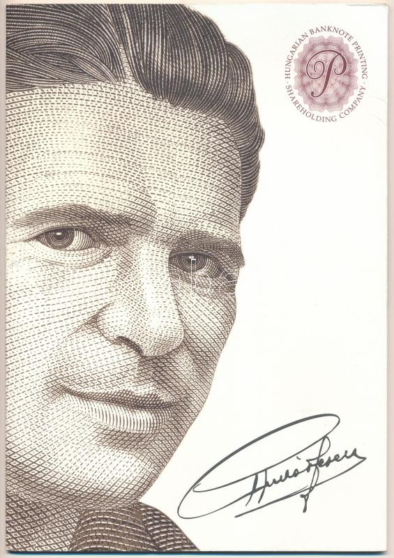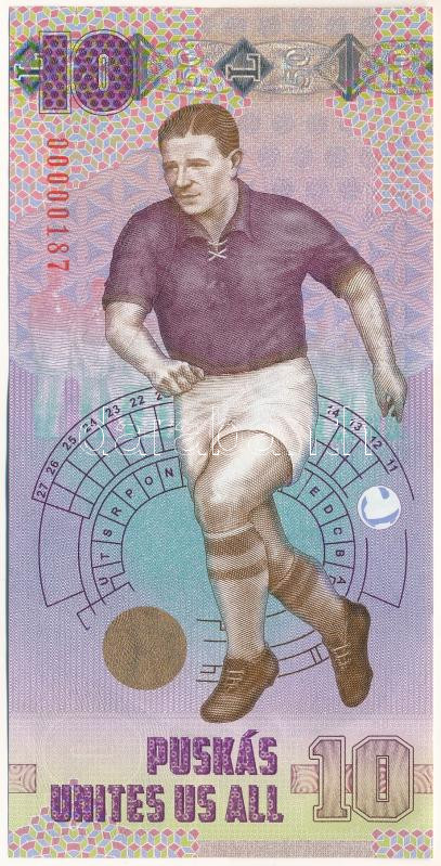 2013. "Puskás bankjegy" "00000187" promóciós bankjegy a Pénzjegynyomda és a Diósgyőri Papírgyár eredeti díszkiadásában, magyar nyelvű tájékoztatóval. Puskás Ferenc (1927-2006) mindössze 16 évesen mutatkozott be a Kispesti AC csapatában s vált a KAC, később a Budapesti Honvéd legendájává. 352 meccsen 360 gólt szerzett, az ötvenes évek válogatottjában, az "Aranycsapatban" pedig 85-ször lépett pályára, s 84 alkalommal volt eredményes, ő szerezte az "évszázad gólját" az angolok elleni 6-3 alkalmával, Olimpiát is nyert a csapattal 1952-ben, 1954-ben azonban "csak" ezüstöt szereztek a Világbajnokságon. 1958-tól a Real Madrid játékosa lett, ahol 180 alkalommal szerepelt, és 156-szor talált az ellenfelek hálójába, de a spanyol válogatottban is bemutatkozott, ahol négy mérkőzésen jutott szóhoz. Máig ő szerezte a legtöbb gólt a BEK (vagy a BL) döntőjében: 1960-ban a Real Madrid 7-3-ra győzte le a Frankfurtot, Puskás négy góllal járult hozzá a sikerhez. T:XF / Hungary 2013. "Puskás Banknote" "00000187" promotional banknote in the original commemorative edition of the Banknote Printing House and the Paper Factory of Diósgyőr, with information in Hungarian. Ferenc Puskás (1927-2006) made his debut for Kispest AC at the age of just 16 and became a legend of KAC, later Budapesti Honvéd. He scored 360 goals in 352 matches, and he played 85 times and was successful 84 times in the national team of the 1950s, the "Golden Team". He scored the "goal of the century" in the 6-3 win against England, and he also won the Olympics with the team in 1952, but in 1954 they "only" won silver at the World Cup. From 1958 he became a Real Madrid player, where he played 180 times and scored 156 times, but he also made his debut for the Spanish national team, where he played four matches. To this day, he has scored the most goals in the European Champion Clubs' Cup (or Champions League) final: in 1960, Real Madrid won against Frankfurt 7-3, Puskás contributing four goals to the title. C:XF