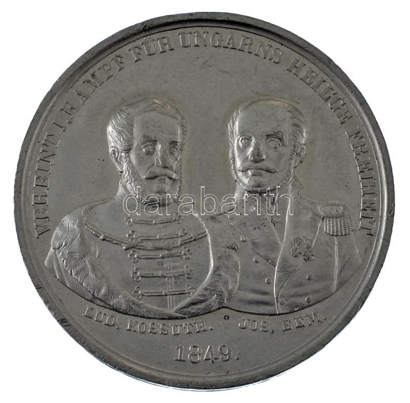 1849 k. "Kossuth Lajos és Bem József közös küzdelme a szent magyar szabadságért" német nyelvű ón emlékérem. Szign.: Drentwett (40mm) T:XF,VF ph, karc / cca. 1849. "The joint struggle of Lajos Kossuth and József Bem for the sacred Hungarian freedom" German-language pewter commemorative medal. Signed: Drentwett (40mm) C:XF,VF edge error, scratches