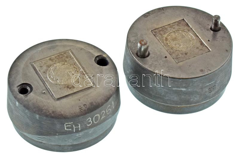 1984. "Tóth Pál: A magyar pénzverés története a XVI. és XVII. században, Miskolc, 1984" című minikönyv borítóján lévő fém lemezplaketthez tartozó verőtő pár, készült a veret kibocsátásának idején a Pénzverőben / Hungary 1984. "Pál Tóth: The history of Hungarian coinage in the 16th and 17th centuries, Miskolc, 1984" the die pair of the metal plaque on the cover of the mini-book, made at the time of the plaque's issuance at the Hungarian Mint