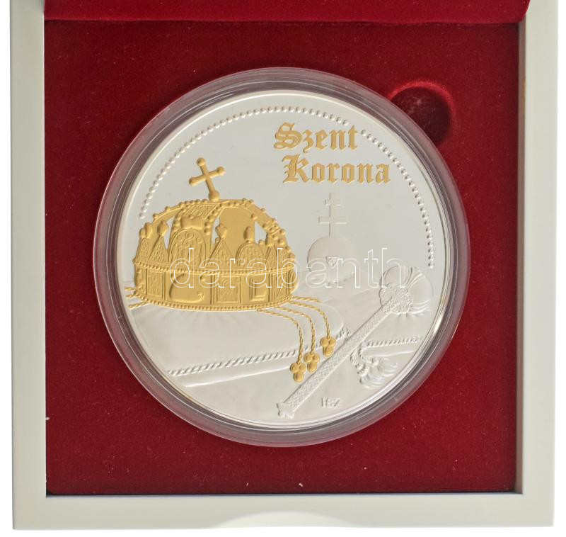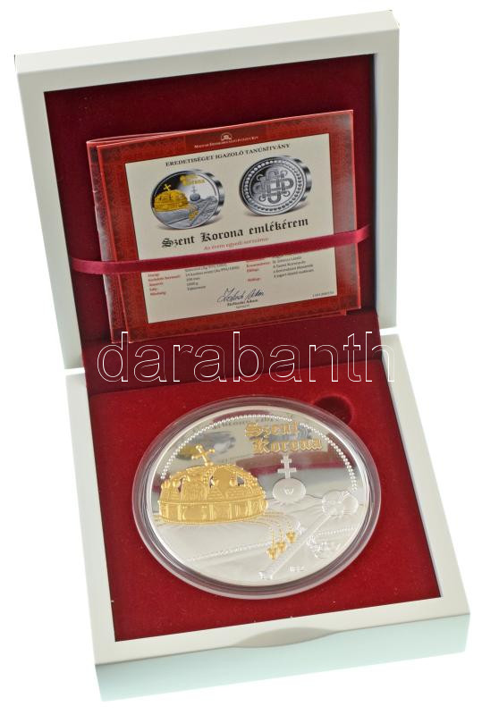 Ifj. Szlávics László (1959-) DN "Szent Korona emlékérem" részben aranyozott, peremén jelzett Ag emlékérem kapszulában, dísztokban, peremén "55/99" sorszámmal, tanúsítvánnyal (1000g/0.999/100mm) T:PP / Hungary ND "Holy Crown" partially gilt Ag medallion, hallmarked on the edge, in capsule, in case, with "55/99" serial number on the edge, with certificate. Sign: László Szlávics Jr. (1000g/0.999/100mm) C:PP