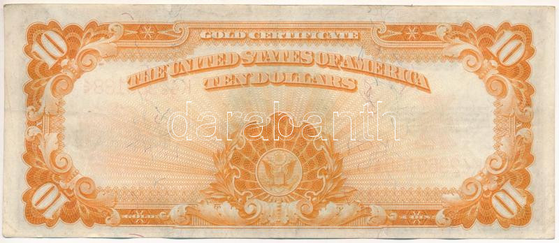 Amerikai Egyesült Államok 1922-1927 (1922) 10$ "Gold Certificate" nagyméretű, sárga pecsét "K42969188" "Harley V. Speelman - Frank White" T:F szép papír / USA 1922-1927 (1922) 10 Dollars "Gold Certificate" large-size, yellow seal "K42969188" "Harley V. Speelman - Frank White" C:F fine paper