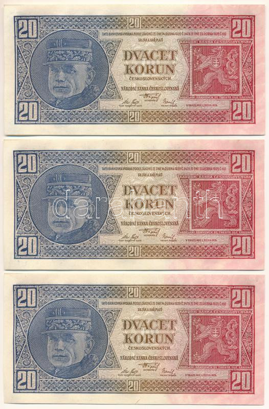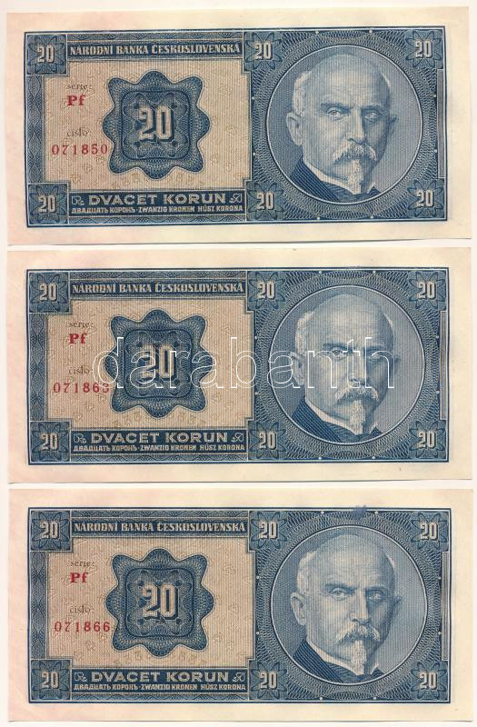Csehszlovákia 1926. 20K (3x) közeli sorszámok: "Pf 071850, Pf 071... https://www.darabanth.com/de/45-Gross-Auktion/45.1/Numismatik/Weltweit-Banknoten~18988/Csehszlovakia-1926-20K-3x-kozeli-sorszamok-Pf-071850-Pf-071863-Pf-071866-TUNC-hullamos-~II3402623