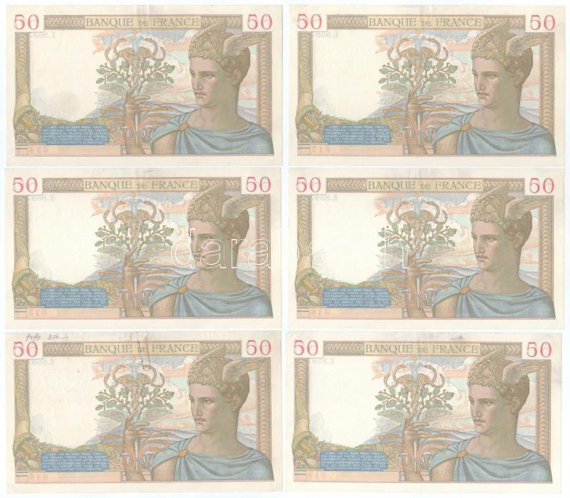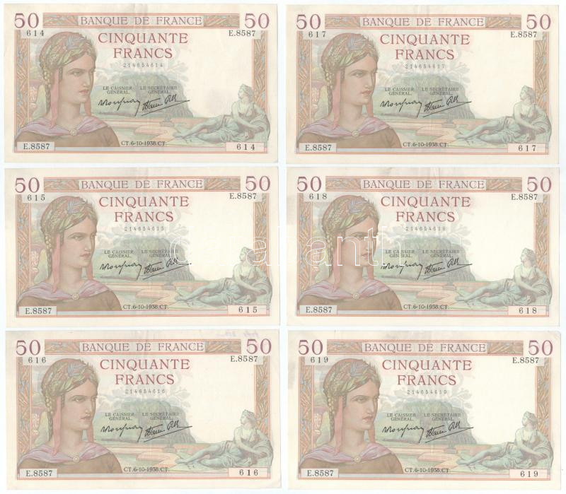 Franciaország 1938. 50Fr (6x) sorszámkövető "E.8587 614 - E.8587 619" T:VF,F szép papír, egyiken tollal írt szöveg /