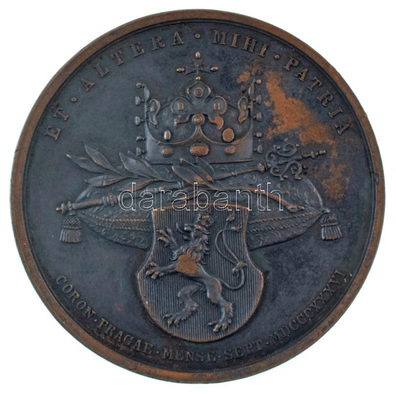 Ausztria 1836."MARIA AVGVSTA FERDINANDI I IMP ET REGIS / ET ALTERA MIHI PATRIA CORON PRAGAE MENSE SEPT MDCCCXXXVI" kétoldalas, bronz, vert emlékérem. Szign.: I. D. BOEHM F. (47mm) T:XF, patina