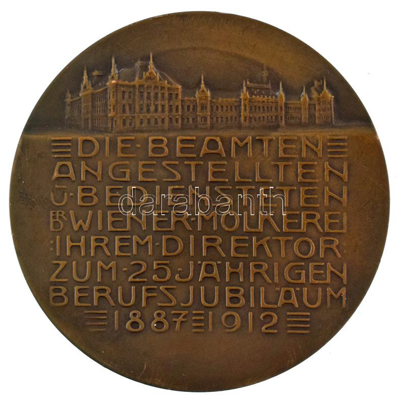 Austria Ludwig Hujer 1912. "DIREKTOR FRANZ J KAISER / DIE BEAMTEN ANGESTELLTEN U BEDIENSTETEN DER WIENER MOLKEREI IHREM DIREKTOR ZUM 25 JäHRIGEN BERUFSJUBILäUM 1887-1912" bronze, struck, double-sided commemorative medal. Sign.: Ludwig Hujer (65mm) T:AU patina