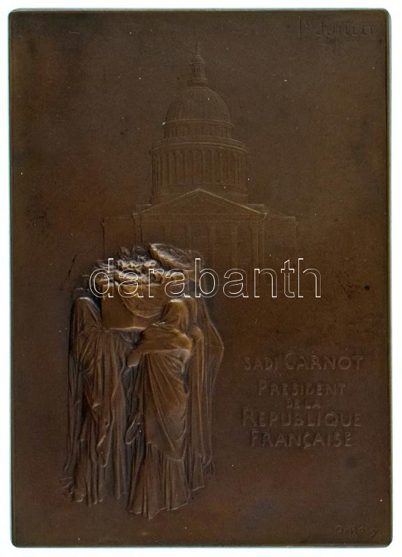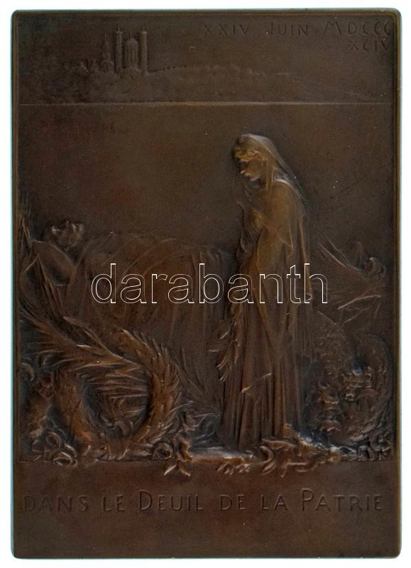 Franciaország 1898. "Sadi Carnot temetése" "XXIV JUIN MDCCC XCIV - DANS LE DEUIL DE LA PATRIE / I-ER JUILLET SADI CARNOT PRESIDENT DE LA REPUBLIQUE FRANCAISE" kétoldalas, vert, peremen jelzett bronz plakett. Szign.: Oscar Roty (80x57mm) T:XF