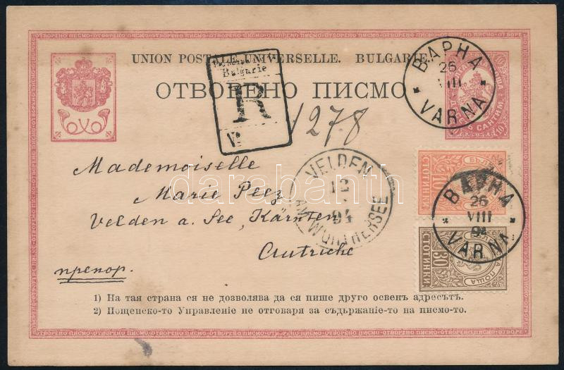 1894 Díjjegyes levelezőlap 2 bélyeges kiegészítéssel / PS-card with ad... https://www.darabanth.com/de/45-Gross-Auktion/45.1/Philatelie-und-Postgeschichte-Ausland/Bulgarien~18903/1894-Dijjegyes-levelezolap-2-belyeges-kiegeszitessel-PS-card-with-additional-franking~II3413751