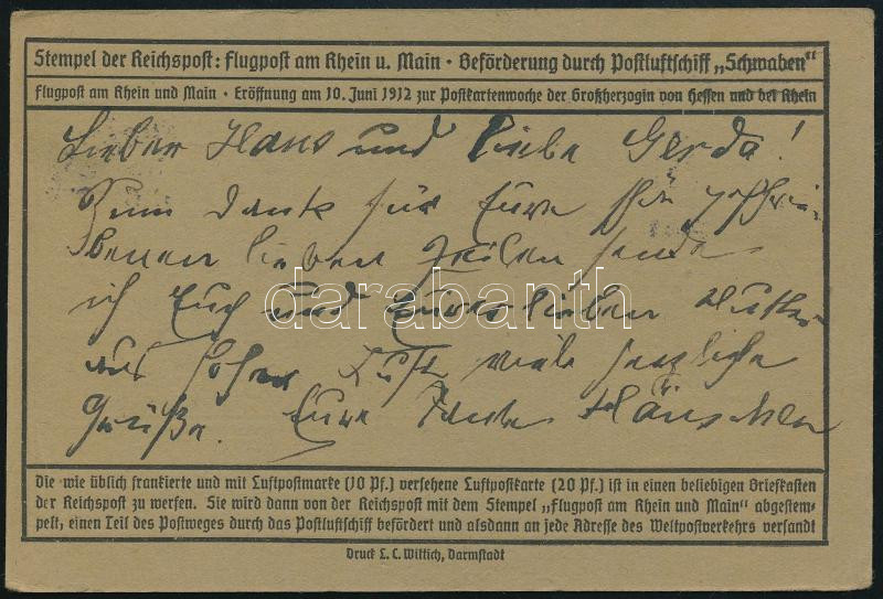 1912 Flugpost am Rhein und am Main alkalmi légi levelezőlap / Postcard https://www.darabanth.com/de/45-Gross-Auktion/45.1/Philatelie-und-Postgeschichte-Ausland/Deutsches-Reich~18946/1912-Flugpost-am-Rhein-und-am-Main-alkalmi-legi-levelezolap-Postcard~II3413459