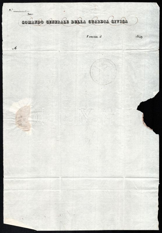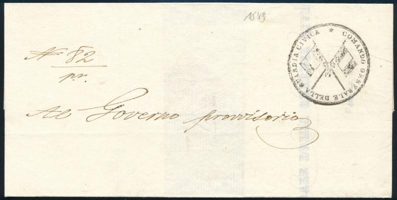 1849 Levél tartalom nélkül / Cover addressed to the Provisional Government. It is actually a turned over sheet of stationery with the letterhead Commando Generale della Guardia Civica, the revolutionary militia of the Republic of San Marco, crossed out. No letter is enclosed, but the cover, marked N. 82, is dated June 18, 1849, during the last phase of the siege of Venice, two months before the surrender of the city. "COMMANDO GENERALE DELLA GUARDIA CIVICA"
