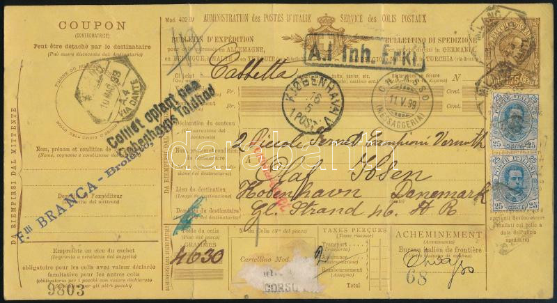 1899 Teljes csomagszállító Dániába / Complete parcel card to Denmark https://www.darabanth.com/de/45-Gross-Auktion/45.1/Philatelie-und-Postgeschichte-Ausland/Italien~18960/1899-Teljes-csomagszallito-Daniaba-Complete-parcel-card-to-Denmark~II3439585