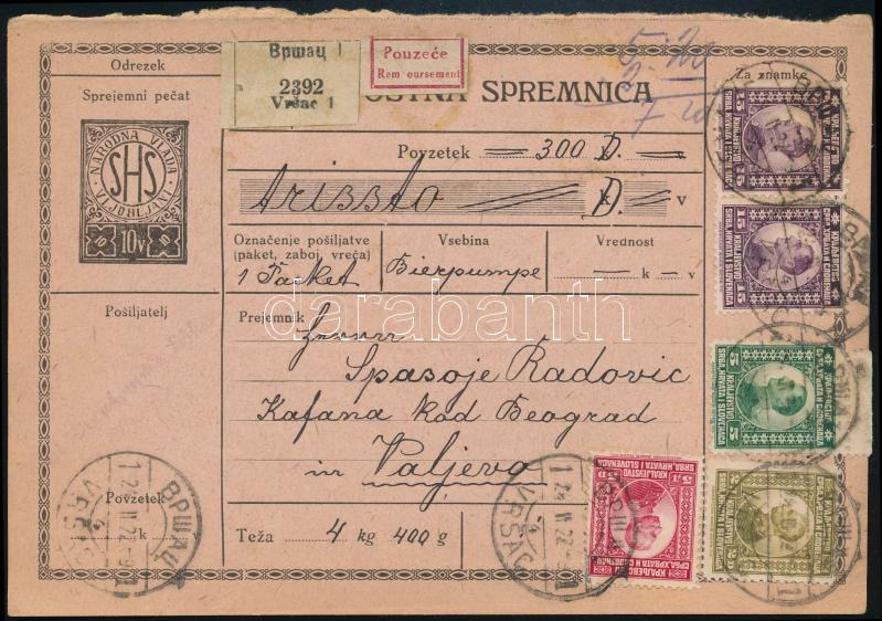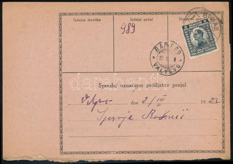 1922 Szállítólevél 6 db bélyeggel / Parcel card with 6 stamps https://www.darabanth.com/de/45-Gross-Auktion/45.1/Philatelie-und-Postgeschichte-Ausland/Jugoslawien~18923/1922-Szallitolevel-6-db-belyeggel-Parcel-card-with-6-stamps~II3439722
