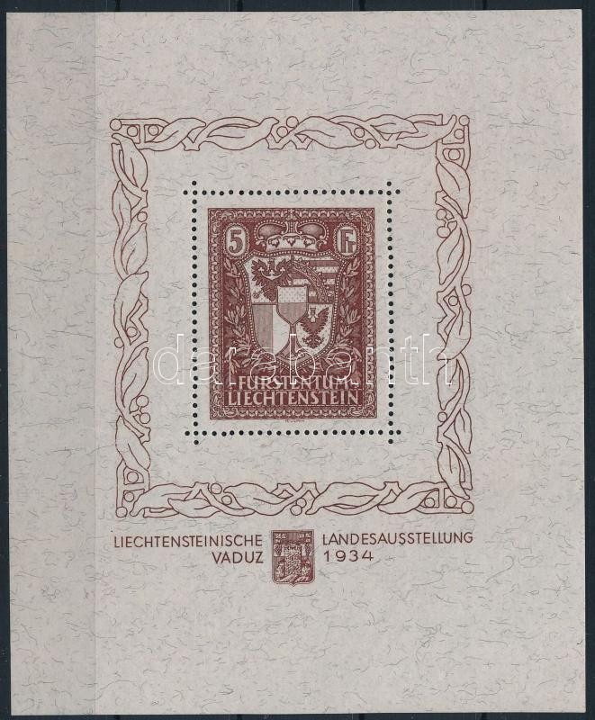 1934 Vaduz blokk Mi 1 szépen centrált jó minőségű, friss színű blokk a kereten alig látható falcnyommal, a bélyeg kifogástalan postatiszta. / Mi block 1 with original gum, almost invisible hinge remnant on margin (Mi EUR 1.700.-)