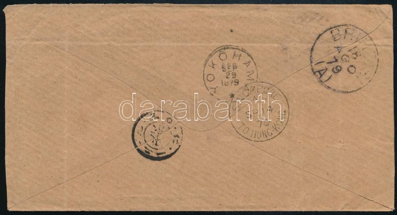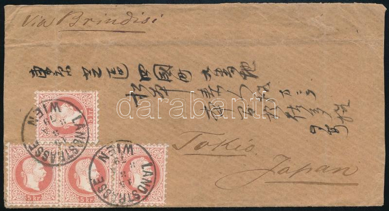 1879 4 x 5kr levélen (még durva nyomat) Bécsből Japánba. Rendkívüli ritkaság, nagyon ritka desztináció!!! / 4 x 5kr on cover from Vienna to Japan by boat. An extraordinary rarity, a very rare destination!!! RRR!! "LANDSTRASSE / WIEN" - "BRINDISI" - "SINGAPORE TO HONG KONG" - "YOKOHAMA"