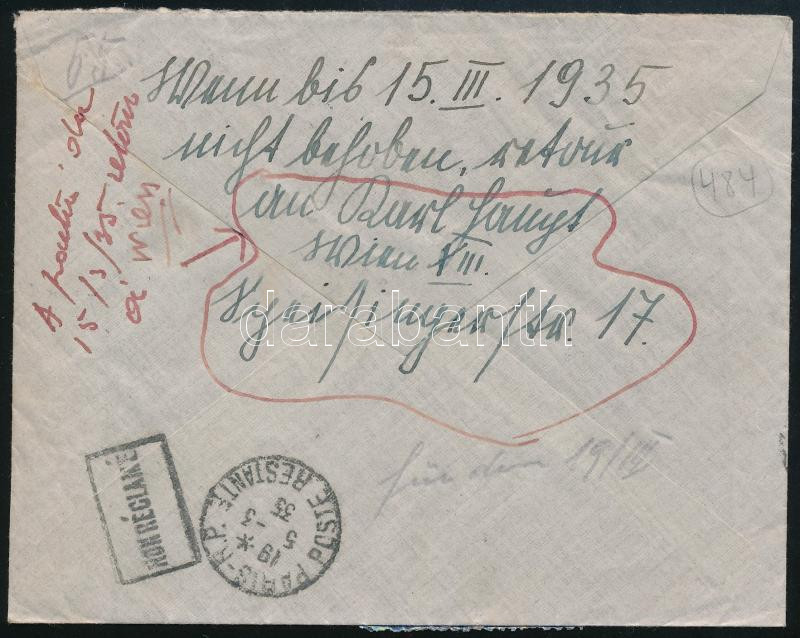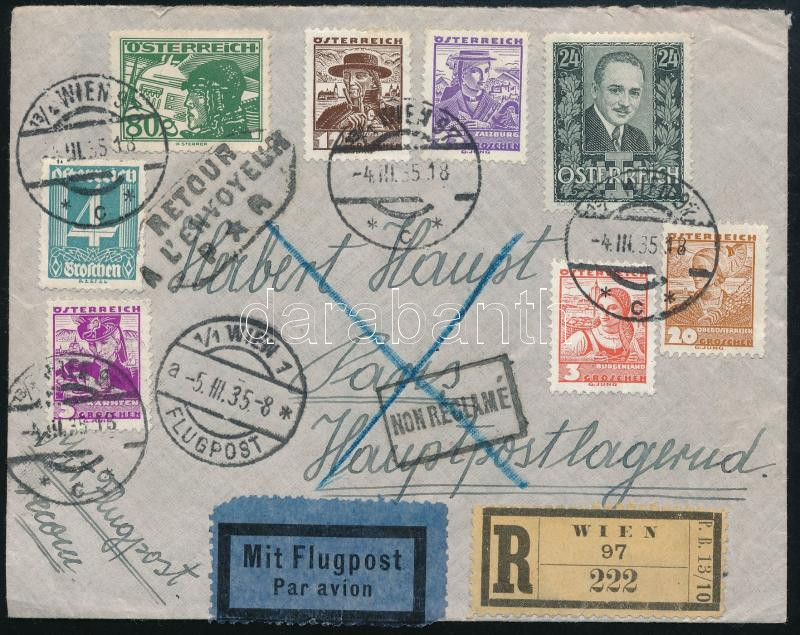 1935 Ajánlott légi levél 8 db bélyeggel Párizsba, visszaküldve / Regis... https://www.darabanth.com/de/45-Gross-Auktion/45.1/Philatelie-und-Postgeschichte-Ausland/Osterreich~18898/1935-Ajanlott-legi-level-8-db-belyeggel-Parizsba-visszakuldve-Registered-airmail-cover-with~II3451838
