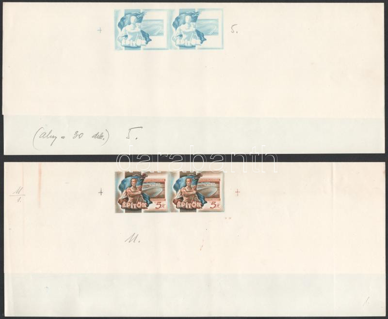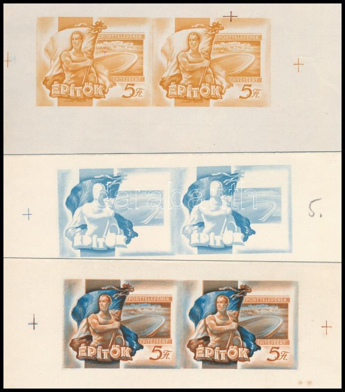 Légrády Sándor által tervezet az Építők sporttelepének építéséért adománybélyegnek 3 db próbanyomata nagy méretű papírlapon (egyik sérült / 1 damaged) 3 charity stamps proof