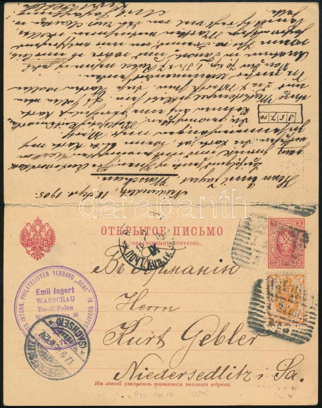 1905 Díjjegyes válaszos levelezőlap Varsóból Németországba, a válaszlap 2 db német bélyeggel felhasználva vissza Varsóba / PS-card to Germany, reply part with 2 German stamps sent back to Warsaw