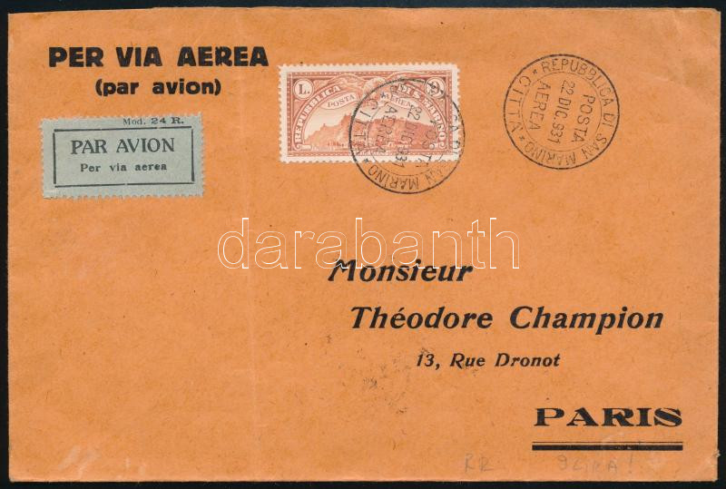 1931 Légi levél 1 bélyeges bérmentesítéssel Párizsba / Airmail cover w... https://www.darabanth.com/de/45-Gross-Auktion/45.1/Philatelie-und-Postgeschichte-Ausland/San-Marino~18964/1931-Legi-level-1-belyeges-bermentesitessel-Parizsba-Airmail-cover-with-9L-franking-to-Pari~II3442257