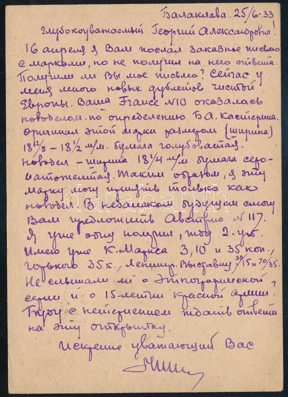 1933 Díjkiegészített díjjegyes levelezőlap / PS-card with additional f... https://www.darabanth.com/de/45-Gross-Auktion/45.1/Philatelie-und-Postgeschichte-Ausland/Sowjetunion~18970/1933-Dijkiegeszitett-dijjegyes-levelezolap-PS-card-with-additional-franking~II3413795