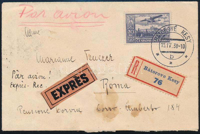 1938 Ajánlott, expressz, légi levél Rómába / Registered express airmai... https://www.darabanth.com/de/45-Gross-Auktion/45.1/Philatelie-und-Postgeschichte-Ausland/Tschechoslowakei~18905/1938-Ajanlott-expressz-legi-level-Romaba-Registered-express-airmail-cover-to-Rome~II2739942