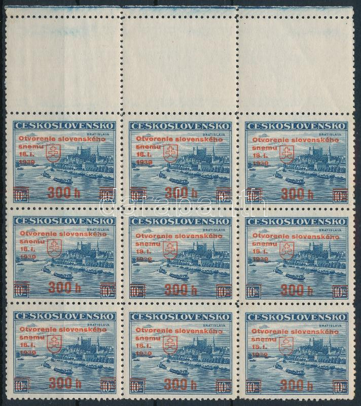 1939 9-es tömb 3 db üres mezővel / Mi 405 block of 9 with blank fields https://www.darabanth.com/de/45-Gross-Auktion/45.1/Philatelie-und-Postgeschichte-Ausland/Tschechoslowakei~18905/1939-9-es-tomb-3-db-ures-mezovel-Mi-405-block-of-9-with-blank-fields~II3444210