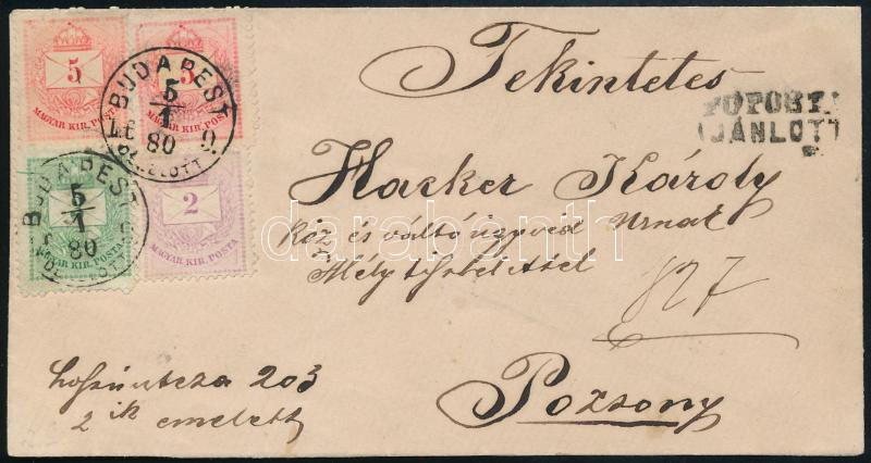 Beschreibung: 1880 Szép ajánlott távolsági levél 3 színű bérmentesítéssel. RRRR! / Registered domestic cover "BUDAPEST / DÉLELŐTT" - Pozsony