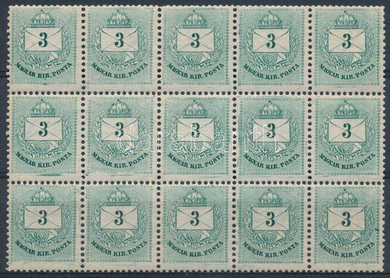 Beschreibung: 1881 Színesszámú 3kr II. típus 12 : 11 1/2 fogazással, lemezhibákkal 15-ös tömbben / Mi 22 block of 15