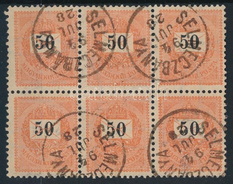 Beschreibung: 1889 50kr hatostömb, ritka összefüggés, lemezösszefüggés, a boríték keresztvonalai az értékszám felett (MBK 440 p) / block of 6 with plate variety