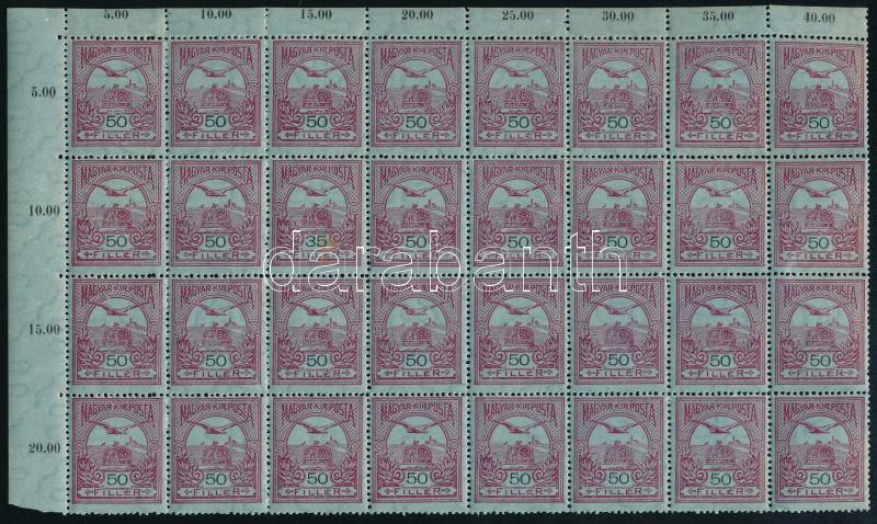 1913 Turul 50f ívsarki 32-es tömb, benne 35f lemezhiba (150.000) (folt a tévnyomatos bélyegen, elvált fogak) / Mi 121 corner block of 32 with 35f plate variety (spot on the stamp, aparted perfs.)
