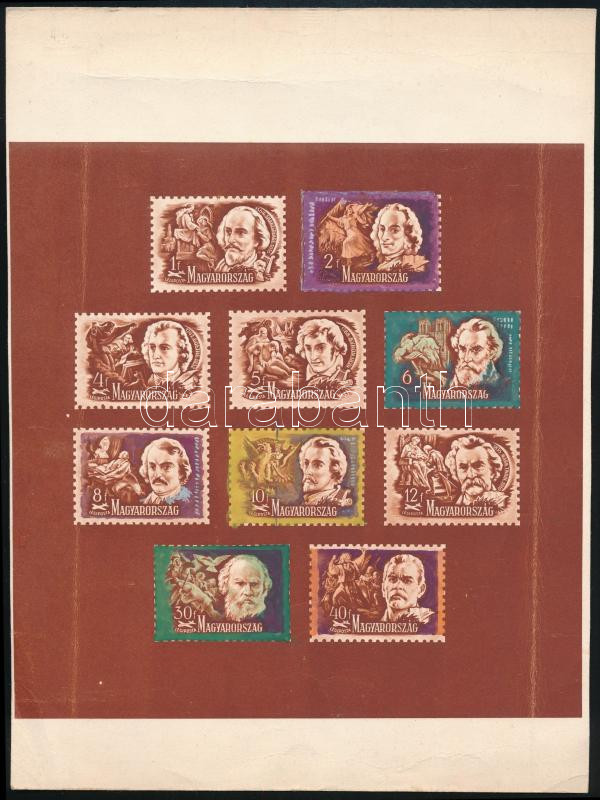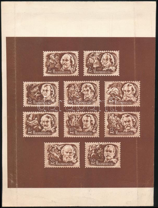 Beschreibung: 1948 Légrády Sándor bélyegterve a Költők-írók sorozathoz, a bélyegképek részben kifestve