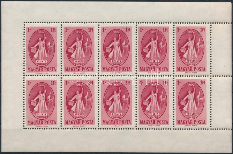Beschreibung: 1949 Puskin tízes kisív bal oldalon fogazatlan ívszéllel (100.000) (ránc, néhány elvált fog) / Mi 1039 sheet (crease, a few aparted perfs)