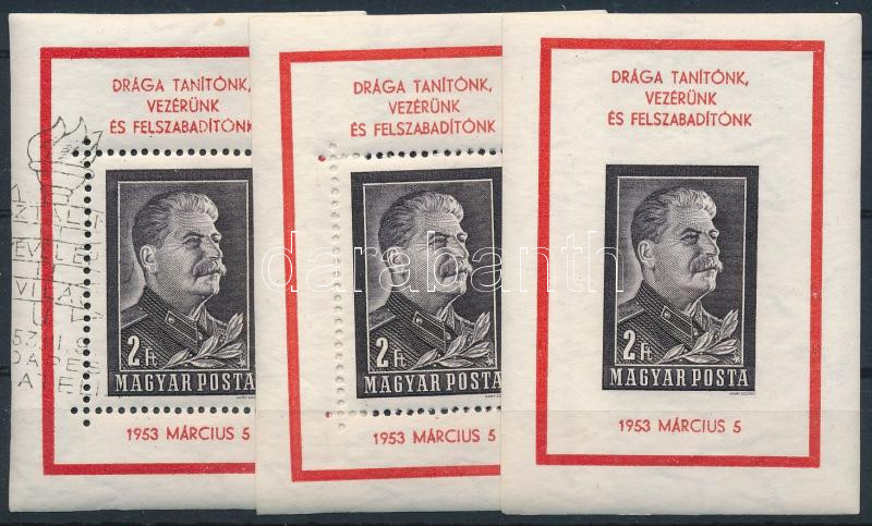 Beschreibung: 1953 3 db Sztálin blokk: fogazott, vágott, első napi bélyegzésű (62.000) / 3 x Mi block 23