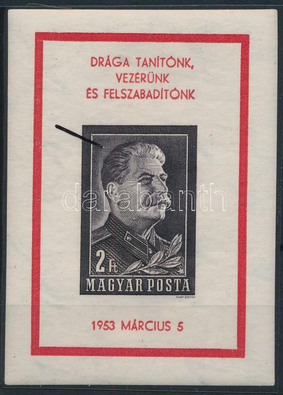 1953 Sztálin vágott blokk apró lemezhibával a fej mögött / Mi 23 imper... https://www.darabanth.com/de/45-Gross-Auktion/45.1/Philatelie-und-Postgesichte-Ungarn-Live/Ausgaben-1946-1956~18715/1953-Sztalin-vagott-blokk-apro-lemezhibaval-a-fej-mogott-Mi-23-imperforate-block-with-plate-~II3442113