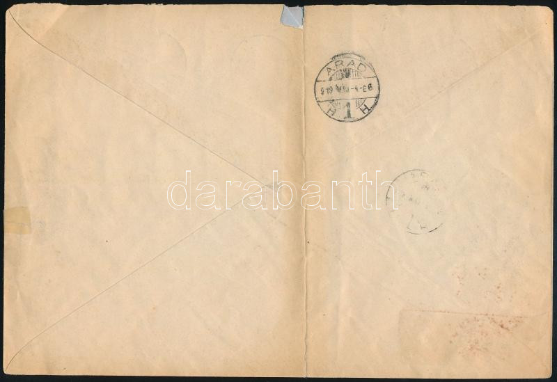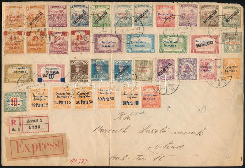 1919 Arad helyi ajánlott expressz nagyalakú levél 37 klf megszállási bélyeggel és első napi bélyegzéssel, érkezési bélyegzéssel, közte elcsúszott felülnyomatok, Portó 100f lemezhibával / Local registered express cover with 37 different stamps and frist day cancellation