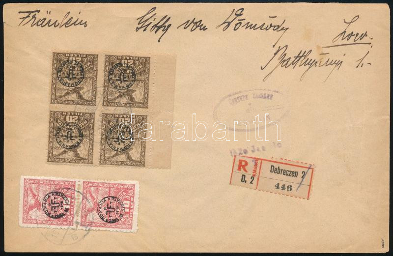 1919 Debrecen cenzúrázott helyi ajánlott levél párral (krétapapír) és négyestömbbel bérmentesítve / Local censored registered cover with pair and block of 4