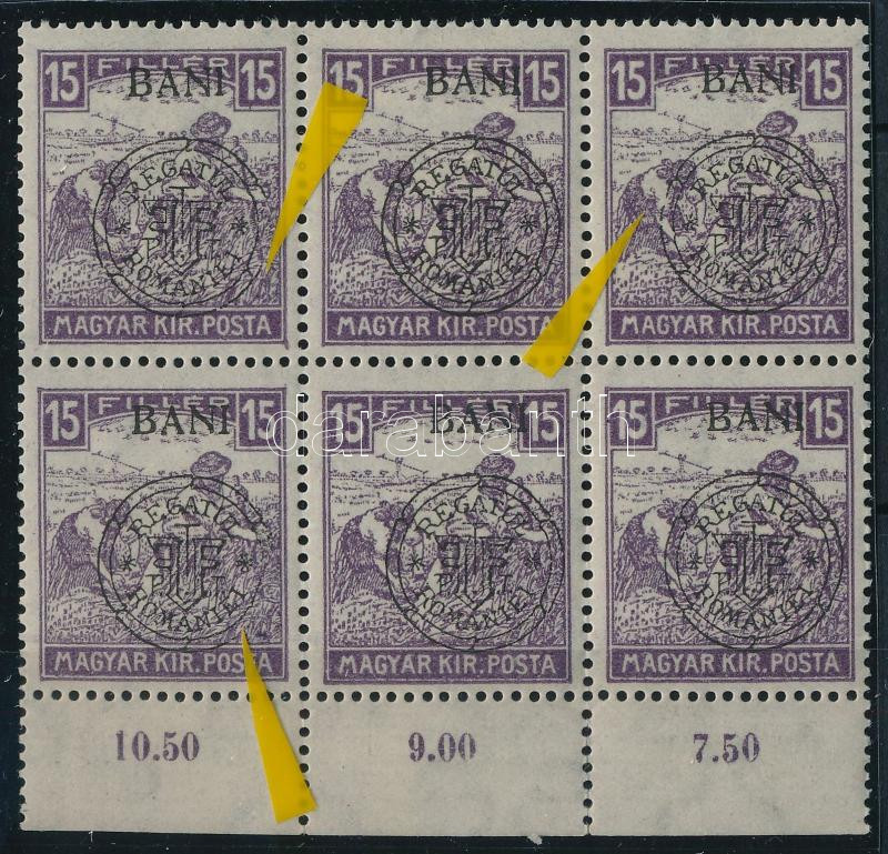 Beschreibung: Kolozsvár 1919 Fehérszámú Arató 15f hatostömb lemezhibákkal /block of 6 with plate varieties