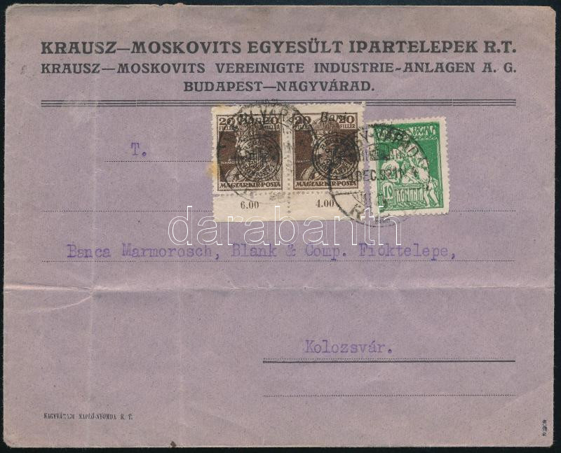 1919 Levél nagyváradi 20f párral és román segélybélyeggel Kolozsvárra ... https://www.darabanth.com/de/45-Gross-Auktion/45.1/Philatelie-und-Postgesichte-Ungarn-Live/Besetzung-und-Lokalausgabe-1919-1921-Nagyvarad~18709/1919-Level-nagyvaradi-20f-parral-es-roman-segelybelyeggel-Kolozsvarra-kuldve-Cover-with-p~II3447467