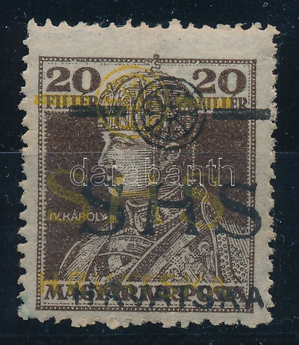 Beschreibung: SHS 1919 Károly 20f arany + fekete színű felülnyomattal, Bodor vizsgálójellel