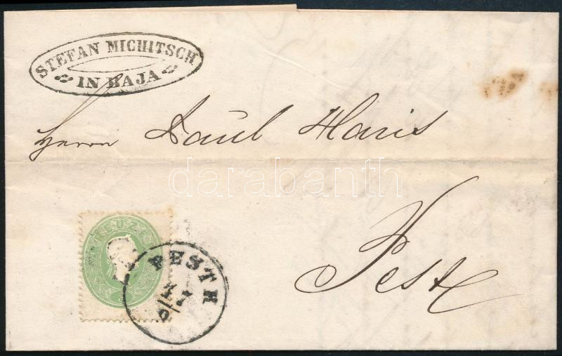 1862 Baján írt, Pesten helyi levélként feladott küldemény 3kr bérmentesítéssel / Cover written in Baja, posted as a local letter in Pest, with 3kr postage due