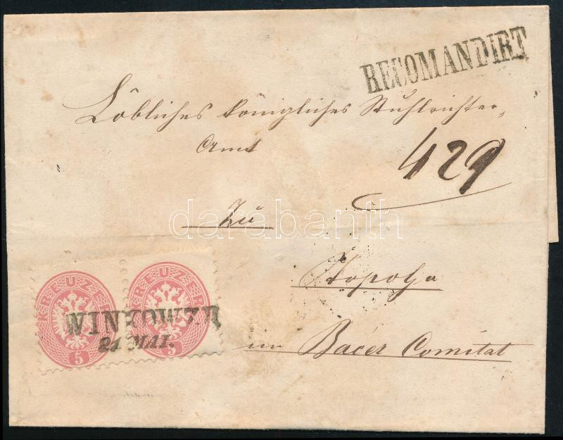 Beschreibung: ~1864 4 x 5kr ajánlott levélen (a hátsó 2 bélyeg sérült) / 4 x 5kr on registered cover (damaged stamps on the back) "WINKOWZE"