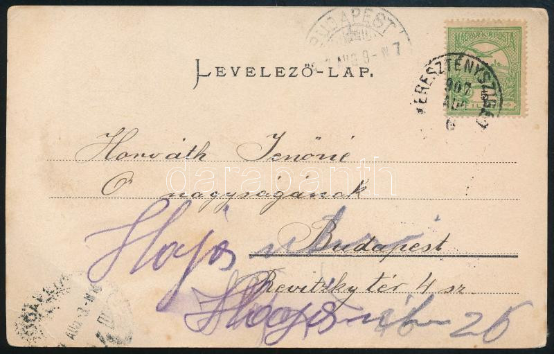 Beschreibung: Hohe Rinne 1907.08.06. Képeslap Budapestre 2h bélyeggel + 5f Turul bérmentesítéssel / 2h Hohe Rinne stamp + 5f Turul on postcard to Budapest