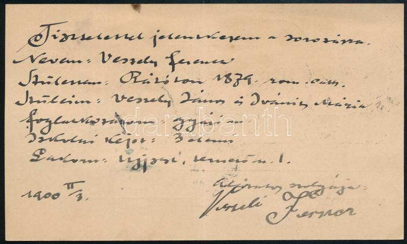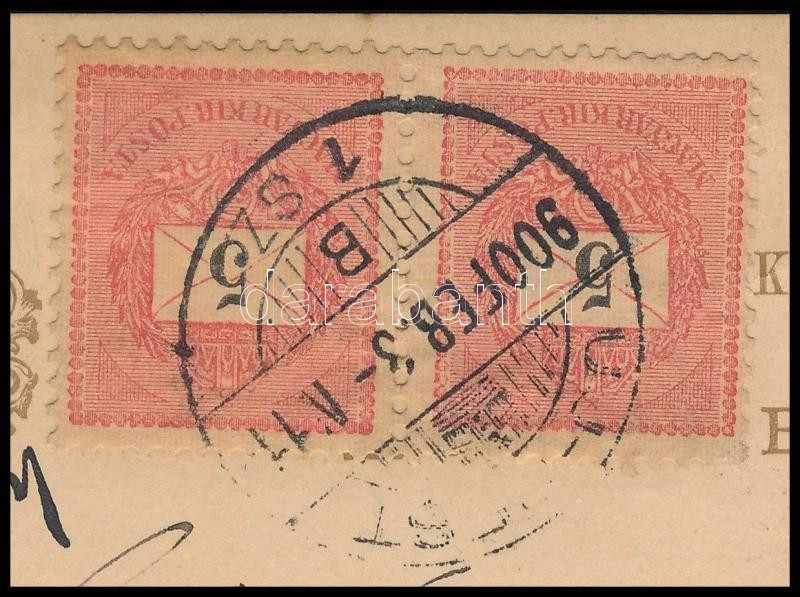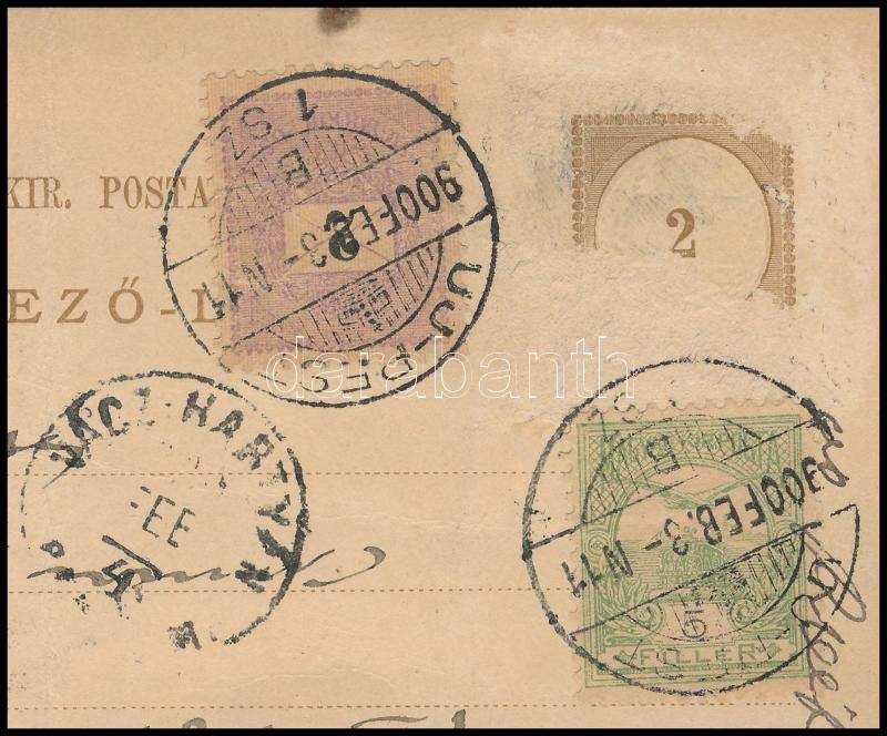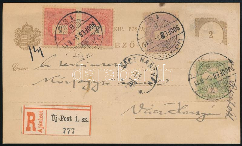 1900 Vegyes bérmentesítésű levelezőlap, a 2kr díjjegyről lekaparva az előző bélyeg, majd ajánlott lapként tarifahelyesen újra bérmentesítve: Feketeszámú 2kr + 5kr pár + Turul 5f, a teljes tarifa 29 fillér. RRR! / Registered postcard with mixed franking (the previous stamp scratched off the 2kr) RRR! "ÚJ-PEST" - Vácz Hartyán