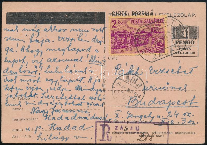Zilah 1945 Overprinted 1P PS-card with 2P additional franking. The number of copies is unknown, the literature only mentions another piece. This is the only known registered PS-card, what is also included in the Catalogue of Hungarian Stamps 2018/II. volume. A huge occupation and PS-card rarity!